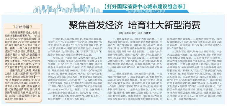 中原区委、区政府按照市委、市政府决策部署,围绕中心工作,全面深化“三标”活动,深度谋划“促消费、增活力、稳增长”工作,发挥资源禀赋优势,扩大优质消费载体,积极培育消费新业态,全方位扩大有效需求,为郑州坚定扛稳“国家队”“领头羊”和经济大市勇挑大梁重任贡献中原区力量。(今日《郑州日报》2版)