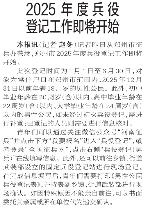 记者昨日从郑州市征兵办获悉,郑州市2025年度兵役登记工作即将开始。(今日《郑州日报》2版)