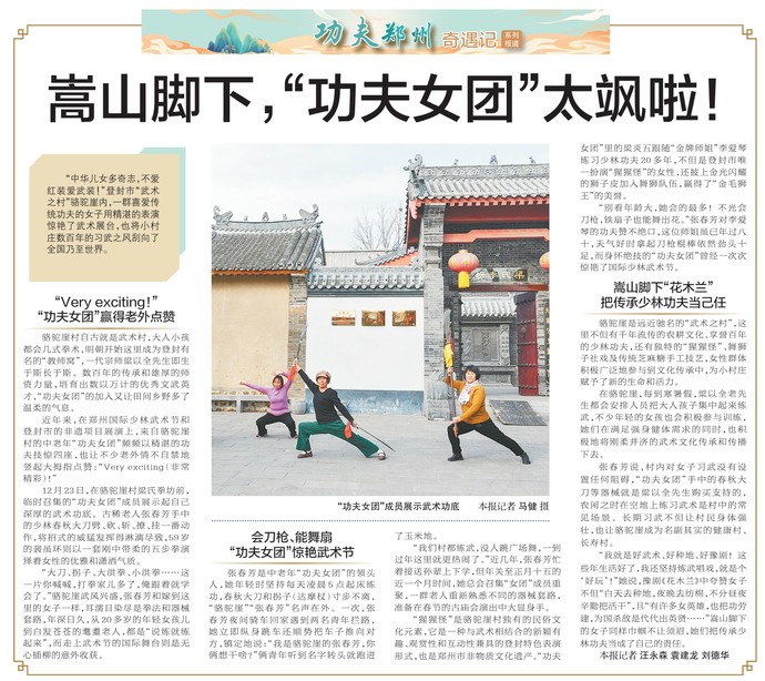 “中华儿女多奇志,不爱红装爱武装!”登封市“武术之村”骆驼崖内,一群喜爱传统功夫的女子用精湛的表演惊艳了武术展台,也将小村庄数百年的习武之风刮向了全国乃至世界。(今日《郑州日报》5版)