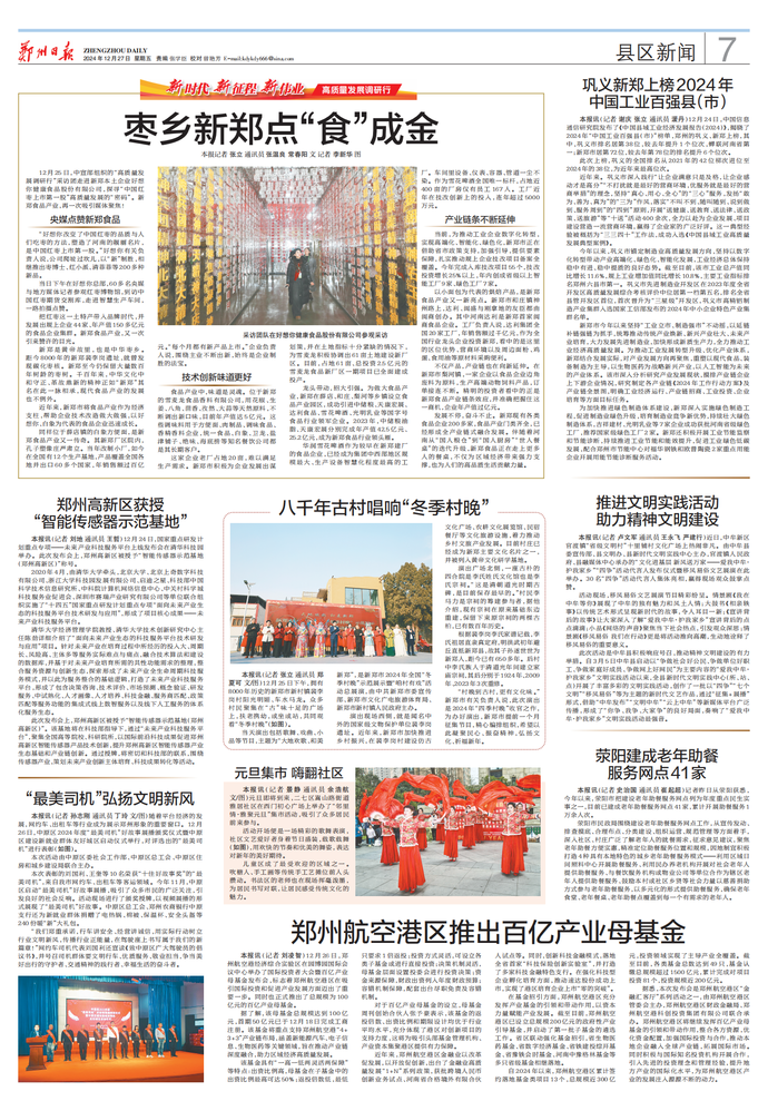 12月25日,中宣部组织的“高质量发展调研行”采访团走进新郑本土企业好想你健康食品股份有限公司,探寻“中国红枣上市第一股”高质量发展的“密码”。新郑食品产业,再一次吸引媒体聚焦!(今日《郑州日报》7版)