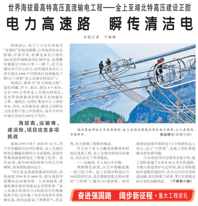 西南深山,电力工人在百米高空“走钢丝”安装间隔棒,让导线保持安全距离;中部平原,机械设备在占地约360亩的终端换流站忙碌作业,电缆敷设量超过1100公里……眼下,近万名建设者正齐心协力,加快建设金沙江上游至湖北±800千伏特高压直流输电工程(以下简称“金上至湖北特高压”)。(今日《人民日报》1版、6版)