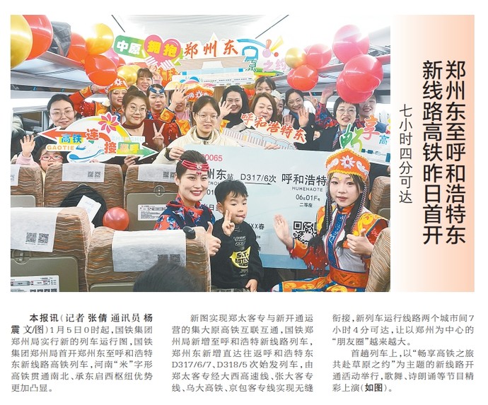 1月5日0时起,国铁集团郑州局实行新的列车运行图,国铁集团郑州局首开郑州东至呼和浩特东新线路高铁列车,河南“米”字形高铁贯通南北、承东启西枢纽优势更加凸显。(今日《郑州日报》1版)