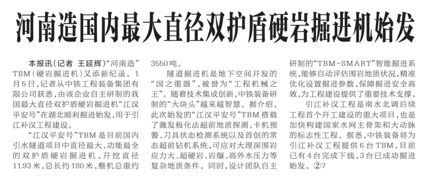 “河南造”TBM(硬岩掘进机)又添新纪录。1月5日,记者从中铁工程装备集团有限公司获悉,由该企业自主研制的我国最大直径双护盾硬岩掘进机“江汉平安号”在湖北顺利掘进始发,用于引江补汉工程建设。(今日《河南日报》1版)