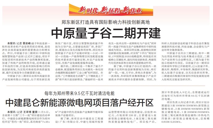 量子科技是新一轮科技革命和产业变革的前沿领域,是经济社会高质量发展的重要推动力和增长点。昨日,中原量子谷二期项目(中原科技城智慧制造产业园)正式开工建设,项目不仅促进郑州高新技术产业的集聚和发展,加速了传统产业的转型升级,还将通过量子科技的引领,打造具有国际影响力的科技创新高地,为实现河南省经济高质量发展、提升区域竞争力贡献重要力量。(今日《郑州日报》5版)