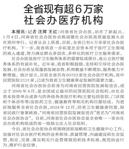 河南省社会办医,站在了新起点。1月4日,河南省社会办医协会换届暨社会办医高质量发展大会在郑州举行。记者从会上获悉,目前,全省已有6万余家社会办医疗机构。下一步,我省将进一步拓宽社会资本用于医疗卫生领域的准入通道,努力满足群众多层次、多样化的医疗卫生服务需求。(今日《郑州日报》2版)