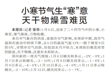 1月5日,迎来了二十四节气中的小寒,小寒至,寒气渐浓,万物收藏。(今日《郑州日报》2版)