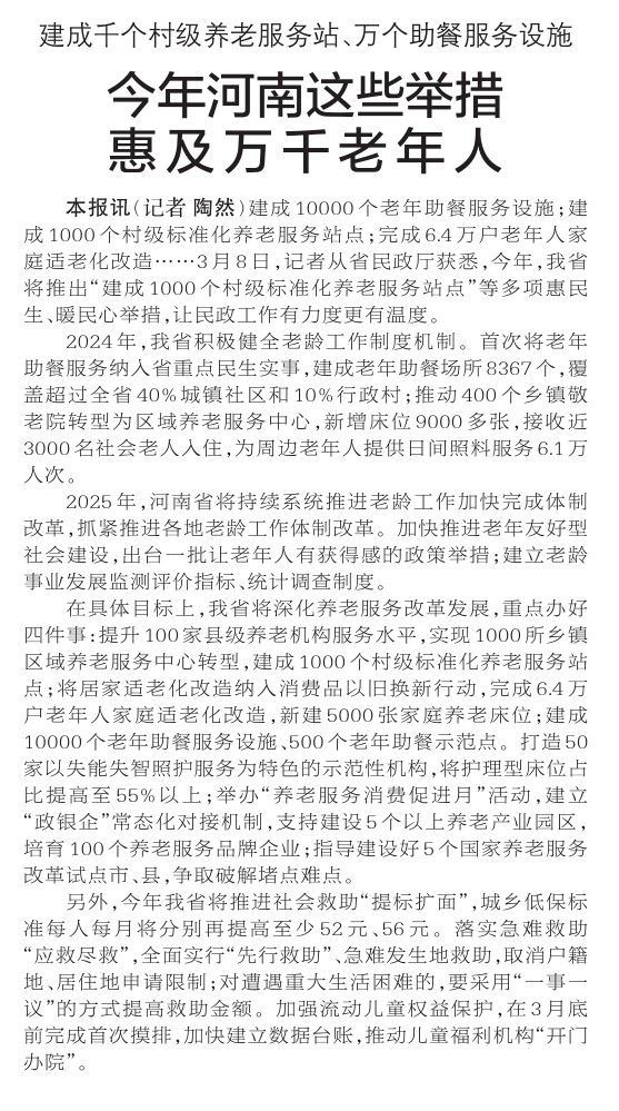 建成10000个老年助餐服务设施;建成1000个村级标准化养老服务站点;完成6.4万户老年人家庭适老化改造……3月8日,记者从省民政厅获悉,今年,我省将推出“建成1000个村级标准化养老服务站点”等多项惠民生、暖民心举措,让民政工作有力度更有温度。(今日《郑州日报》2版)