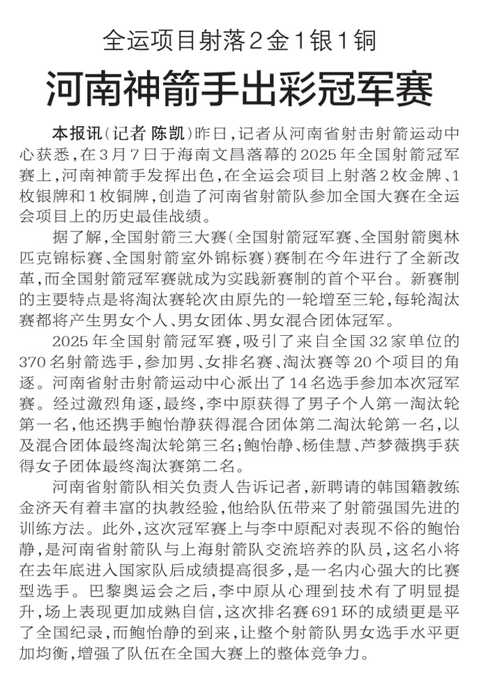 本报讯(记者 陈凯)昨日,记者从河南省射击射箭运动中心获悉,在3月7日于海南文昌落幕的2025年全国射箭冠军赛上,河南神箭手发挥出色,在全运会项目上射落2枚金牌、1枚银牌和1枚铜牌,创造了河南省射箭队参加全国大赛在全运会项目上的历史最佳战绩。(今日《郑州日报》2版)