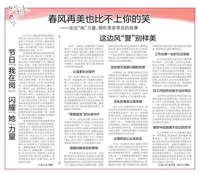 她们一身藏蓝,英姿飒爽,为警营增添了一抹抹亮色,她们将点点微光汇聚成了不起的“她力量”,撑起了公安事业的“半边天”,她们以侠骨柔肠坚定地履行人民警察的职责与担当,在“三八国际妇女节”到来之际,让我们走近这个群体,一起来感受“她”力量,倾听她们笑容背后的故事。(今日《郑州日报》2版)
