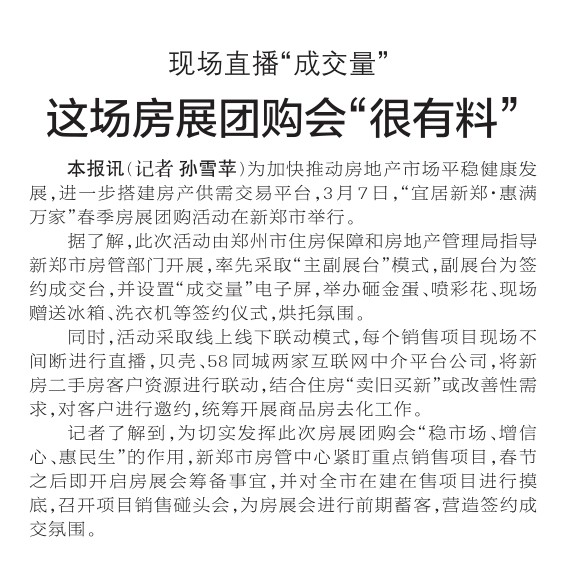 为加快推动房地产市场平稳健康发展,进一步搭建房产供需交易平台,3月7日,“宜居新郑·惠满万家”春季房展团购活动在新郑市举行。(今日《郑州日报》2版)