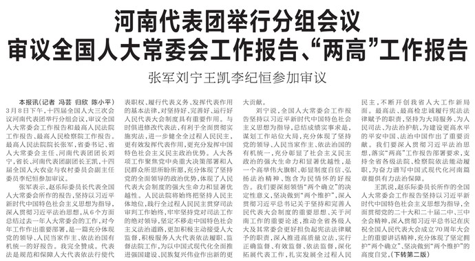 3月8日下午,十四届全国人大三次会议河南代表团举行分组会议,审议全国人大常委会工作报告和最高人民法院工作报告、最高人民检察院工作报告。最高人民法院院长张军,省委书记、省人大常委会主任、河南代表团团长刘宁,省长、河南代表团副团长王凯,十四届全国人大农业与农村委员会副主任委员李纪恒参加审议。(今日《河南日报》1版、2版)