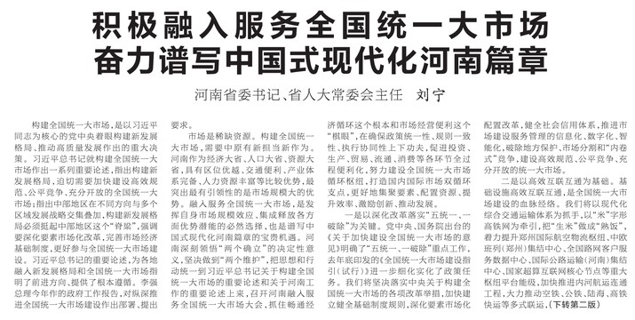 构建全国统一大市场,是以习近平同志为核心的党中央着眼构建新发展格局、推动高质量发展作出的重大决策。习近平总书记就构建全国统一大市场作出一系列重要论述,指出构建新发展格局,迫切需要加快建设高效规范、公平竞争、充分开放的全国统一大市场;指出中部地区在不同方向与多个区域发展战略交集叠加,构建新发展格局必须挺起中部地区这个“脊梁”,强调要深化要素市场化改革,完善市场经济基础制度,更好参与全国统一大市场建设。习近平总书记的重要论述,为各地融入新发展格局和全国统一大市场指明了前进方向、提供了根本遵循。李强总理今年作的政府工作报告,对纵深推进全国统一大市场建设作出部署、提出要求。(今日《河南日报》1版、2版)