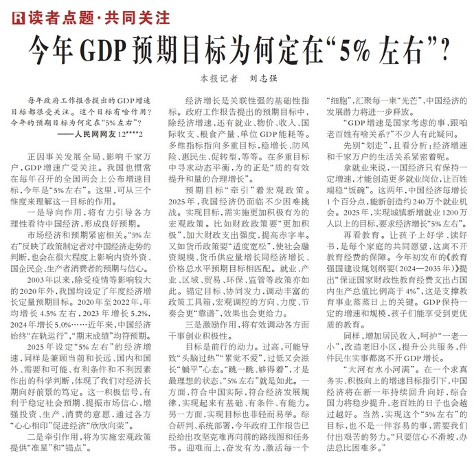 正因事关发展全局、影响千家万户,GDP增速广受关注。我国也惯常在每年召开的全国两会上公布增速目标,今年是“5%左右”。这里,可从三个维度来理解这一目标的作用。(今日《人民日报》1版)