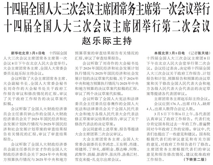 十四届全国人大三次会议主席团常务主席第一次会议举行 十四届全国人大三次会议主席团举行第二次会议