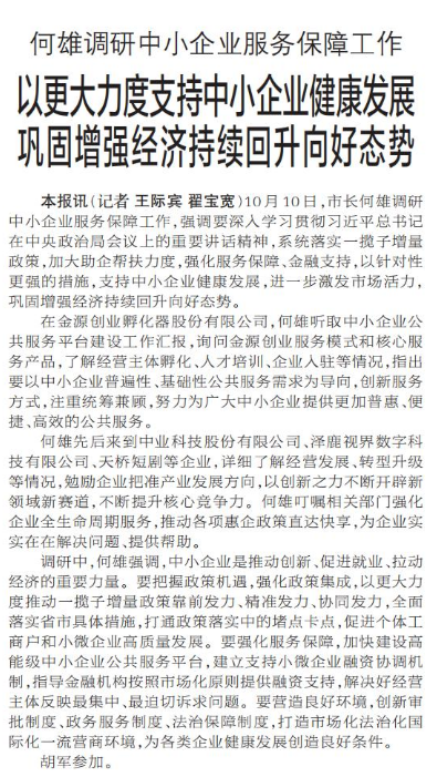 10月10日,市长何雄调研中小企业服务保障工作,强调要深入学习贯彻习近平总书记在中央政治局会议上的重要讲话精神,系统落实一揽子增量政策,加大助企帮扶力度,强化服务保障、金融支持,以针对性更强的措施,支持中小企业健康发展,进一步激发市场活力,巩固增强经济持续回升向好态势。(今日《郑州日报》1版)