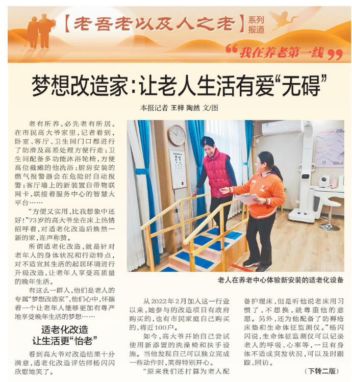 老有所养,必先老有所居。在市民高大爷家里,记者看到,卧室、客厅、卫生间门口都进行了防滑及高差处理方便行走;卫生间配备多功能沐浴轮椅,方便高位截瘫的他洗浴;厨房安装的燃气报警器会在危险时自动报警;客厅墙上的新装置自带物联网卡,联接着服务中心的智慧大平台……(今日《郑州日报》1版、2版)