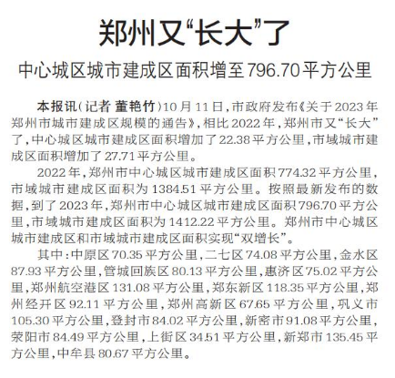 10月11日,市政府发布《关于2023年郑州市城市建成区规模的通告》,相比2022年,郑州市又“长大”了,中心城区城市建成区面积增加了22.38平方公里,市域城市建成区面积增加了27.71平方公里。(今日《郑州日报》1版)