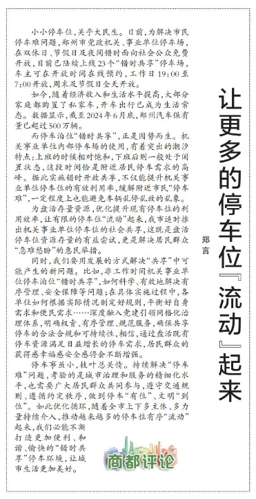 小小停车位,关乎大民生。日前,为解决市民停车难问题,郑州市党政机关、事业单位停车场,在双休日、节假日及夜间错时面向社会公众免费开放,目前已陆续上线23个“错时共享”停车场,车主可在开放时间在线预约,工作日19:00至7:00开放,周末及节假日全天开放。(今日《郑州日报》2版)