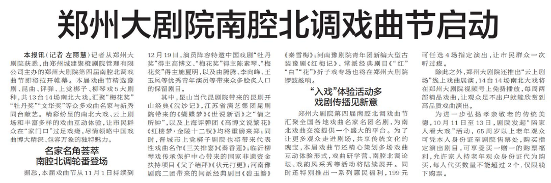 记者从郑州大剧院获悉,由郑州城建聚橙剧院管理有限公司主办的郑州大剧院第四届南腔北调戏曲节即将拉开帷幕。本届戏曲节精选豫剧、昆曲、评弹、上党梆子、柳琴戏5大剧种,共13台14场南北大戏,汇聚“梅花奖”“牡丹奖”“文华奖”等众多戏曲名家与新秀同台献艺。精彩纷呈的南北大戏、云上剧场和丰富多样的戏曲互动体验,让市民群众在“家门口”过足戏瘾,尽情领略中国戏曲博大精深、包容万象的独特魅力。(今日《郑州日报》4版)