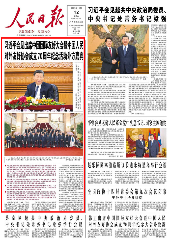 10月11日上午,国家主席习近平在北京人民大会堂集体会见出席中国国际友好大会暨中国人民对外友好协会成立70周年纪念活动的外方嘉宾。(今日《人民日报》1版、2版)