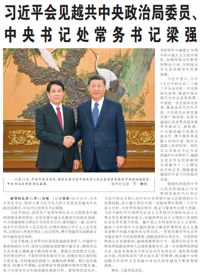 10月11日,中共中央总书记、国家主席习近平在人民大会堂会见越共中央政治局委员、中央书记处常务书记梁强。(今日《人民日报》1版)