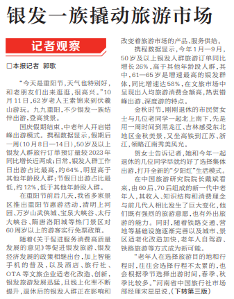 “今天是重阳节,天气也特别好,和老朋友们出来逛逛,很高兴。”10月11日,62岁老人王素锦来到伏羲山游玩。九九重阳,不少银发一族结伴出游,登高赏景。(今日《河南日报》1版、3版)