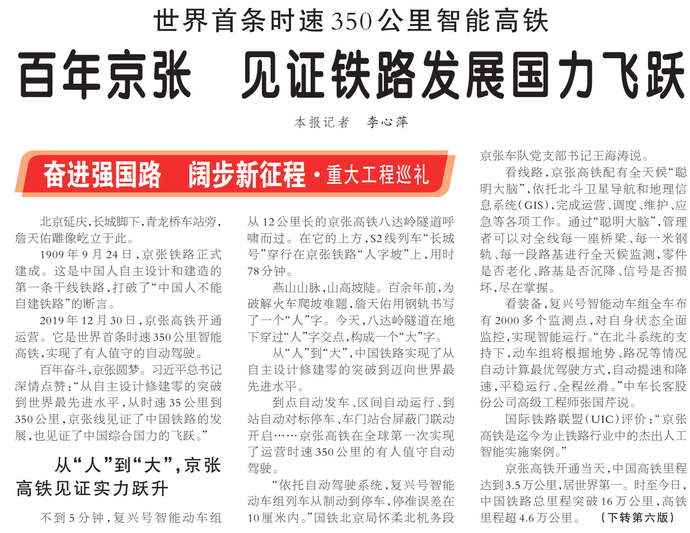 1909年9月24日,京张铁路正式建成。这是中国人自主设计和建造的第一条干线铁路,打破了“中国人不能自建铁路”的断言。(今日《人民日报》1版、6版)