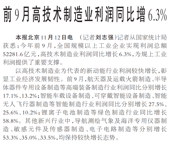 记者从国家统计局获悉:今年前9月,全国规模以上工业企业实现利润总额52281.6亿元,高技术制造业利润同比增长6.3%,为规上工业利润提供了重要支撑。(今日《人民日报》1版)