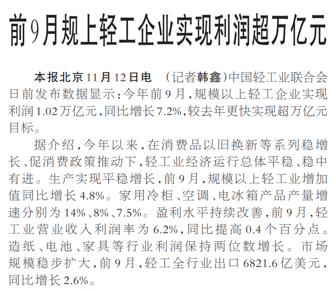 前9月规上轻工企业实现利润超万亿元