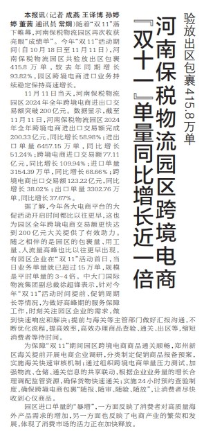 河南保税物流园区跨境电商 “双十一”单量同比增长近一倍