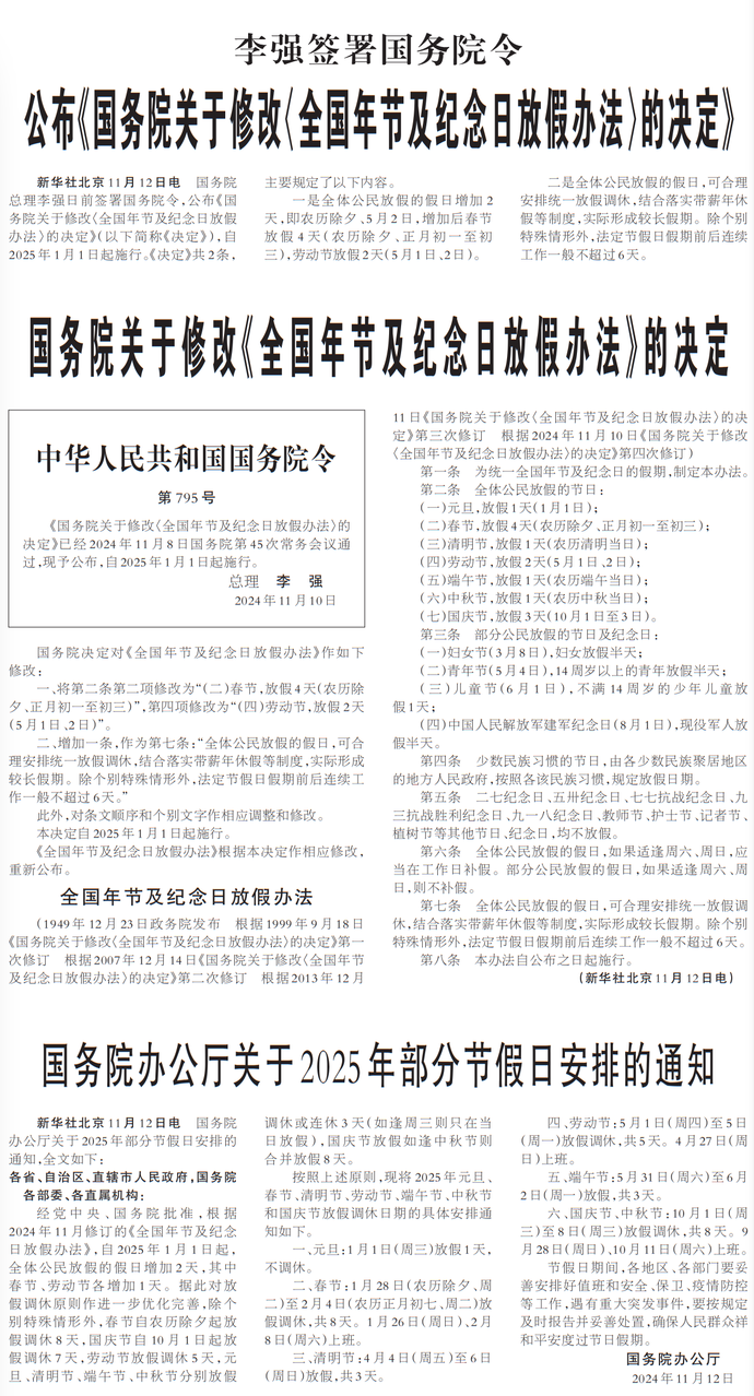 国务院总理李强日前签署国务院令,公布《国务院关于修改〈全国年节及纪念日放假办法〉的决定》(以下简称《决定》),自2025年1月1日起施行。《决定》共2条,主要规定了以下内容。
