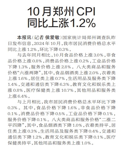 国家统计局郑州调查队昨日发布信息,2024年10月,我市居民消费价格总水平同比上涨1.2%,环比下降0.3%。(今日《郑州日报》2版)