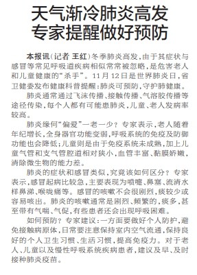 天气渐冷肺炎高发 专家提醒做好预防