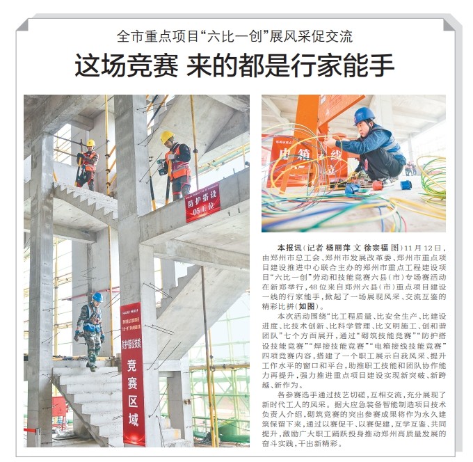 11月12日,由郑州市总工会、郑州市发展改革委、郑州市重点项目建设推进中心联合主办的郑州市重点工程建设项目“六比一创”劳动和技能竞赛六县(市)专场赛活动在新郑举行,48位来自郑州六县(市)重点项目建设一线的行家能手,掀起了一场展现风采、交流互鉴的精彩比拼。(今日《郑州日报》2版)