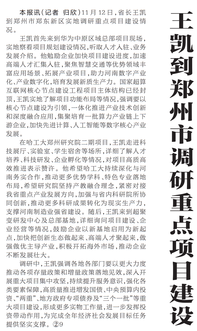 11月12日,省长王凯到郑州市郑东新区实地调研重点项目建设情况。(今日《河南日报》1版)