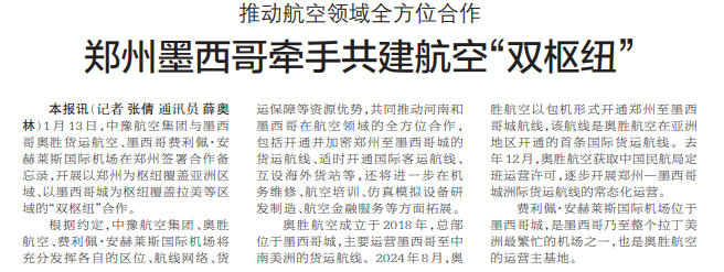 1月13日,中豫航空集团与墨西哥奥胜货运航空、墨西哥费利佩·安赫莱斯国际机场在郑州签署合作备忘录,开展以郑州为枢纽覆盖亚洲区域、以墨西哥城为枢纽覆盖拉美等区域的“双枢纽”合作。(今日《郑州日报》1版)