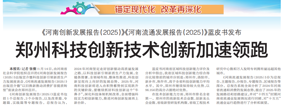 1月14日,由河南省社会科学院组织召开的《河南创新发展报告(2025)》出版宣介暨科技创新引领新质生产力发展座谈会、《河南流通发展报告(2025)》出版宣介暨“以旧换新推动消费扩容提质转型”座谈会在郑州召开。(今日《郑州日报》2版)