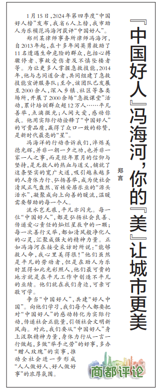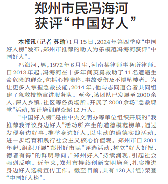 1月15日,2024年第四季度“中国好人榜”发布,郑州市推荐的助人为乐模范冯海河获评“中国好人”。(今日《郑州日报》2版)