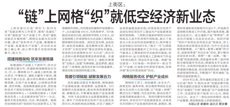 上街区委以打造“郑在飞·航向未来”党建品牌为工作抓手,聚焦“党建红”引领“通航蓝”全产业链工作,首创“通航试验区专属网格”,围绕企业最为关注的问题,推动“组织串在产业链、难题解在产业链、发展谋在产业链”,在办好企业职工操心事、烦心事中提升党组织的凝聚力、战斗力。(今日《郑州日报》7版)