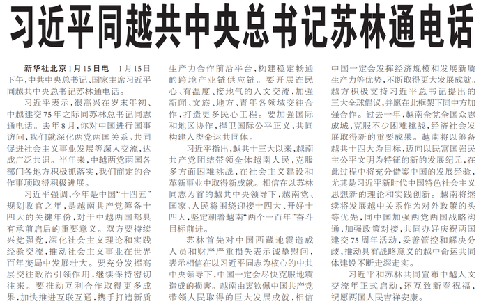 1月15日下午,中共中央总书记、国家主席习近平同越共中央总书记苏林通电话。(今日《人民日报》1版)