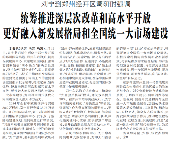 1月15日,省委书记刘宁到位于郑州经开区的郑州国际陆港、郑州车站海关、河南保税物流中心、京东物流园调研,强调要深刻领悟“两个确立”的决定性意义,坚决做到“两个维护”,深入贯彻落实习近平总书记关于构建新发展格局的重要论述和关于河南工作的重要讲话重要指示批示精神,把准定位,发挥优势,统筹推进深层次改革和高水平开放,更好融入新发展格局和全国统一大市场建设,为谱写中国式现代化河南篇章注入强大动力活力。(今日《河南日报》1版)
