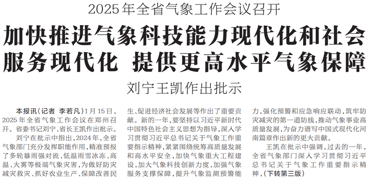 1月15日,2025年全省气象工作会议在郑州召开。省委书记刘宁、省长王凯作出批示。(今日《河南日报》1版、3版)