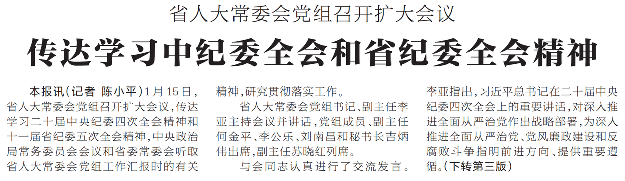 1月15日,省人大常委会党组召开扩大会议,传达学习二十届中央纪委四次全会精神和十一届省纪委五次全会精神,中央政治局常务委员会会议和省委常委会听取省人大常委会党组工作汇报时的有关精神,研究贯彻落实工作。(今日《河南日报》1版、3版)