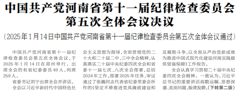 中国共产党河南省第十一届纪律检查委员会第五次全体会议,于2025年1月14日在郑州举行。出席全会的有省纪委委员49人,列席259人。