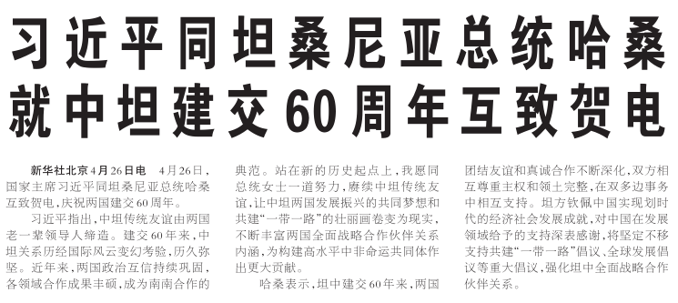 4月26日,国家主席习近平同坦桑尼亚总统哈桑互致贺电,庆祝两国建交60周年。