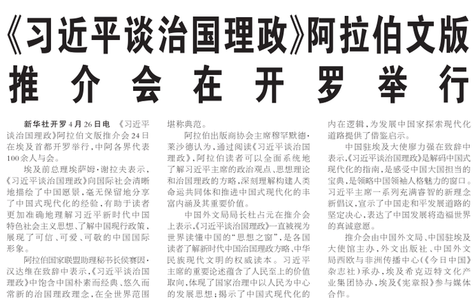 《习近平谈治国理政》阿拉伯文版推介会24日在埃及首都开罗举行,中阿各界代表100余人与会。(今日《人民日报》1版)