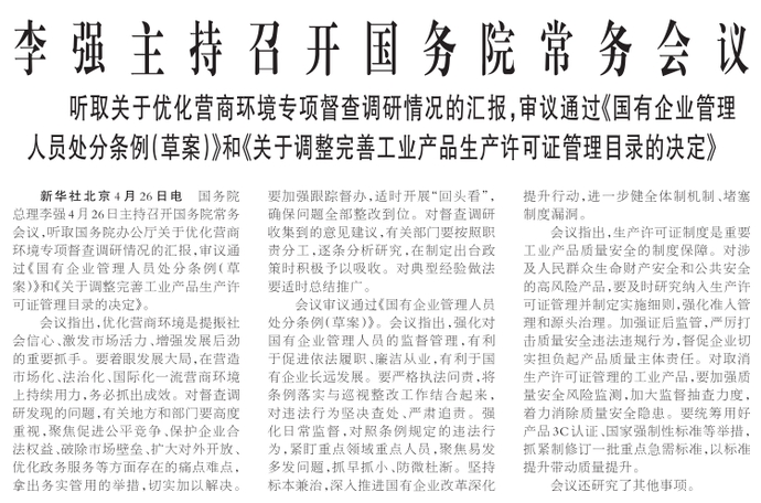 国务院总理李强4月26日主持召开国务院常务会议,听取国务院办公厅关于优化营商环境专项督查调研情况的汇报,审议通过《国有企业管理人员处分条例(草案)》和《关于调整完善工业产品生产许可证管理目录的决定》。(今日《人民日报》1版)