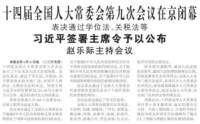 十四届全国人大常委会第九次会议26日上午在北京人民大会堂闭幕。会议经表决,通过了学位法,关税法,关于修改农业技术推广法、未成年人保护法、生物安全法的决定。国家主席习近平分别签署第22、23、24号主席令予以公布。赵乐际委员长主持闭幕会。(今日《人民日报》1版)
