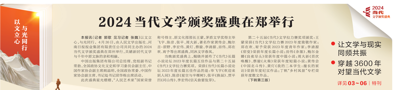以文立心,与光同行。4月26日,由人民文学出版社、河南日报报业集团有限责任公司共同主办的2024当代文学颁奖盛典在郑州举行,共睹新时代文学与千年中原文脉的亲和相融。(今日《河南日报》1版)