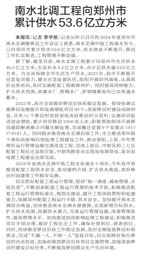 记者从昨日召开的2024年度郑州市南水北调暨移民工作会议上获悉,南水北调中线工程通水至今,已向郑州市累计供水53.6亿立方米,供水效益不断提升,移民工作扎实推进,工程管理不断加强。(今日《郑州日报》1版)